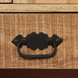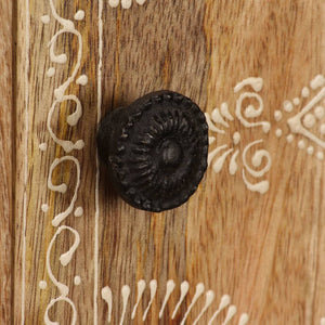 Skänken är handgjord av mangoträ som är massivt och vackert, och de handsnidade detaljerna bidrar till dess spektakulära retrostil. Varje steg i processen utförs med största omsorg, vare sig det är polering, målning eller lackering. Hantverksskickligheten och de vackra träådringarna gör varje möbel unik. Denna skänk är designad med 3 hyllor, 4 skåp och 5 lådor och har gott om utrymme för att hålla olika föremål organiserade och inom räckhåll. Den kan även användas som ett konsolbord eller förvaringsskåp. Stålbenen bidrar till möbelns robusthet samt dess industriella charm. Monteringen är enkel.