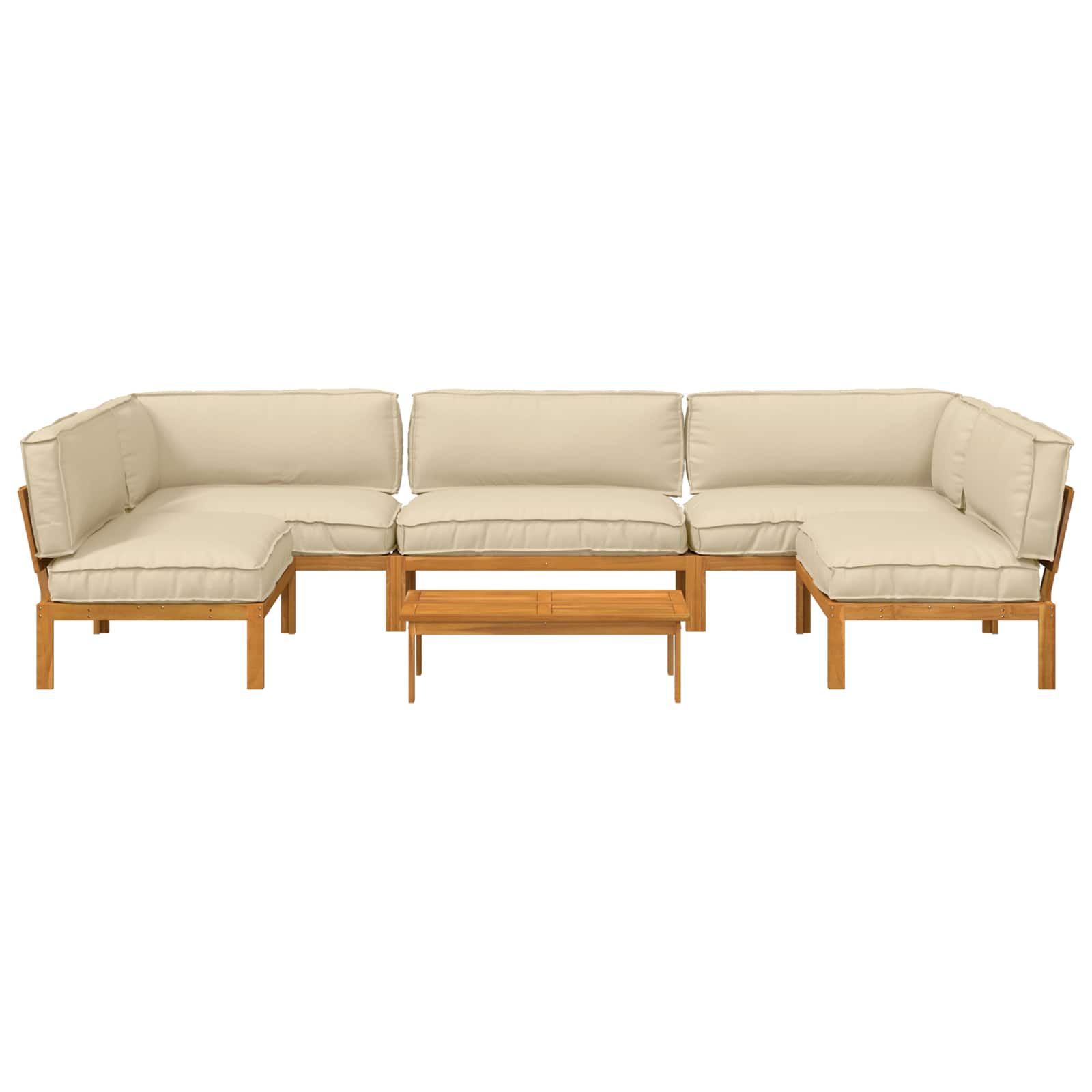 - Massiv akaciaträ konstruktion Soffgruppen är byggd av massivt akaciaträ, känt för sin hållbarhet och varma färger. Träet har en oljefinish som skyddar mot fukt och framhäver den naturliga färgen, vilket gör det perfekt för utomhusbruk.