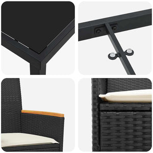 - Kompletta set-komponenter: Med en stålram, konstrottingsitsar, träarmstöd och smala träben, bidrar alla delar till både hållbarhet och komfort. Det eleganta glasbordet ger en fin finish och är enkelt att rengöra. Dessutom ger skumkuddarna skön komfort som gör utomhusmåltiderna bättre.